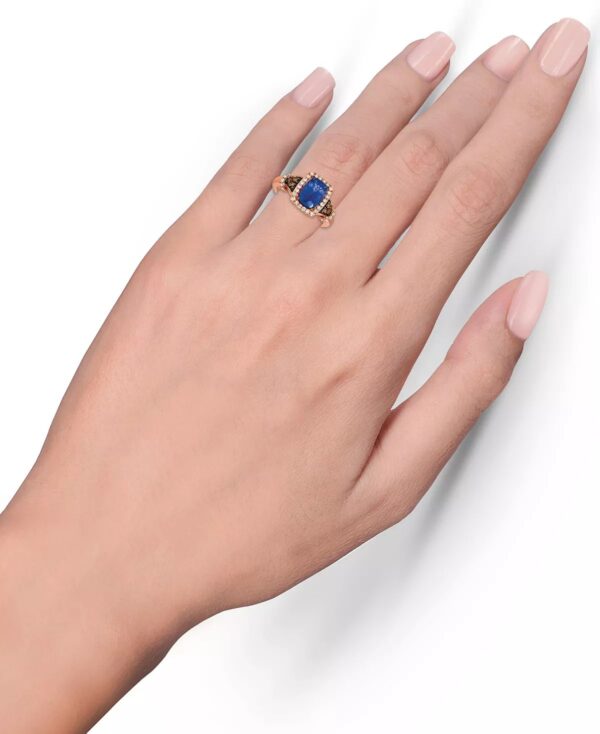 A striking cushion-cut Blueberry Tanzanite? (2 ct. t.w.) makes a cool contrast to the warm tones of Nude? (1/3 ct. t.w.) and Chocolate Diamonds? (1/8 ct. t.w.) set in rich 14k Strawberry Gold?