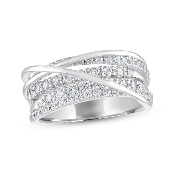 Gorgeous rows of glittering round independently certified diamonds flow atop this ring for her. The ring is crafted in 14K white gold and features intertwined diamond details that make this ring unique and breathtaking with a total diamond weight of 1 carat.