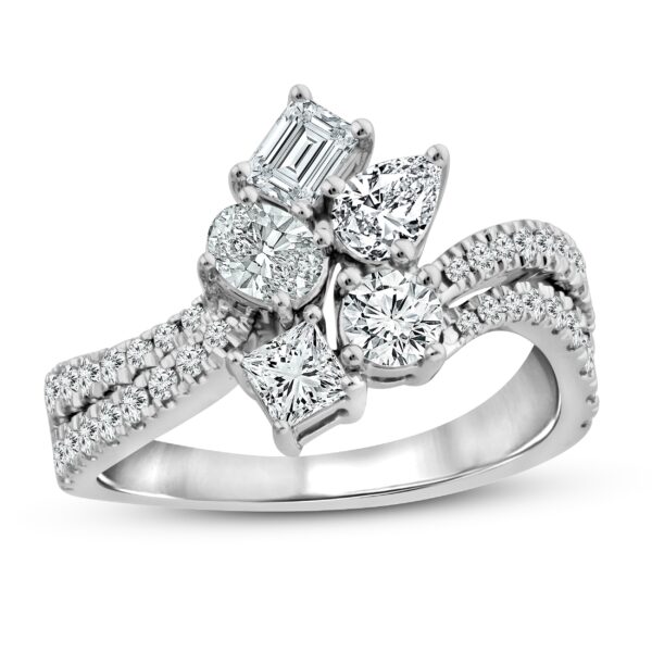 This enchanting diamond ring collection features five distinctively-shaped diamonds, symbolic of everything she means to you. Each diamond shape has a different meaning, from integrity and wisdom, to confidence, totality, and elegance. The beautiful 10K white gold ring features an oval-cut, emerald-cut, pear-shaped, round-cut, and princess-cut diamond at the center, while ribbons of brilliant round-cut diamonds flow outward. The gorgeous ring has a total diamond weight of 1 1/2 carats.