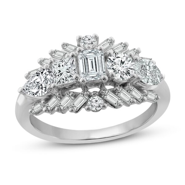 This mesmerizing diamond ring collection features five distinctively-shaped diamonds, symbolic of everything she means to you. Each diamond shape has a different meaning, from integrity and wisdom, to confidence, totality, and elegance. This stunning 10K white gold ring features a pear-shaped, princess-cut, emerald-cut, round-cut and oval-cut diamond set across the center. Sparkling baguette-cut diamonds flank outward above and below, with two brilliant round-cut diamonds finishing the iconic look. The ring has a total diamond weight of 2 carats.